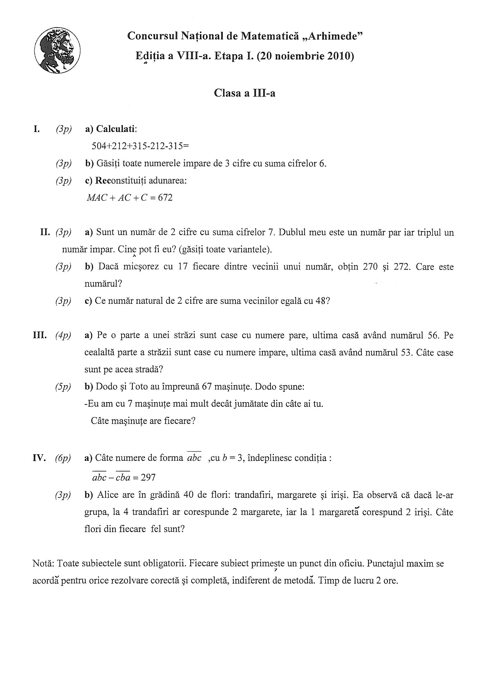 - Subiecte Arhimede Etapa I 20 noiembrie 2010 Clasa a III-a